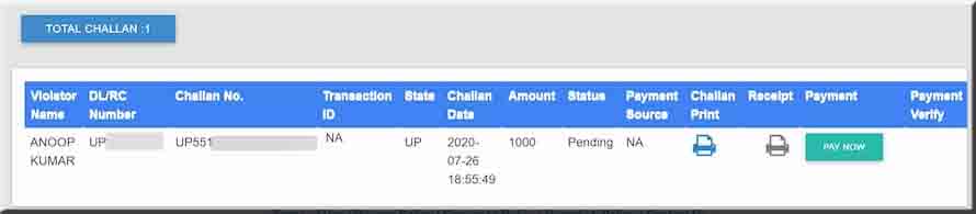 नोट : हर राज्य की वैबसाइट अलग अलग होता है जहां वहाँ नंबर डालकर चालान देखा जा सकता है